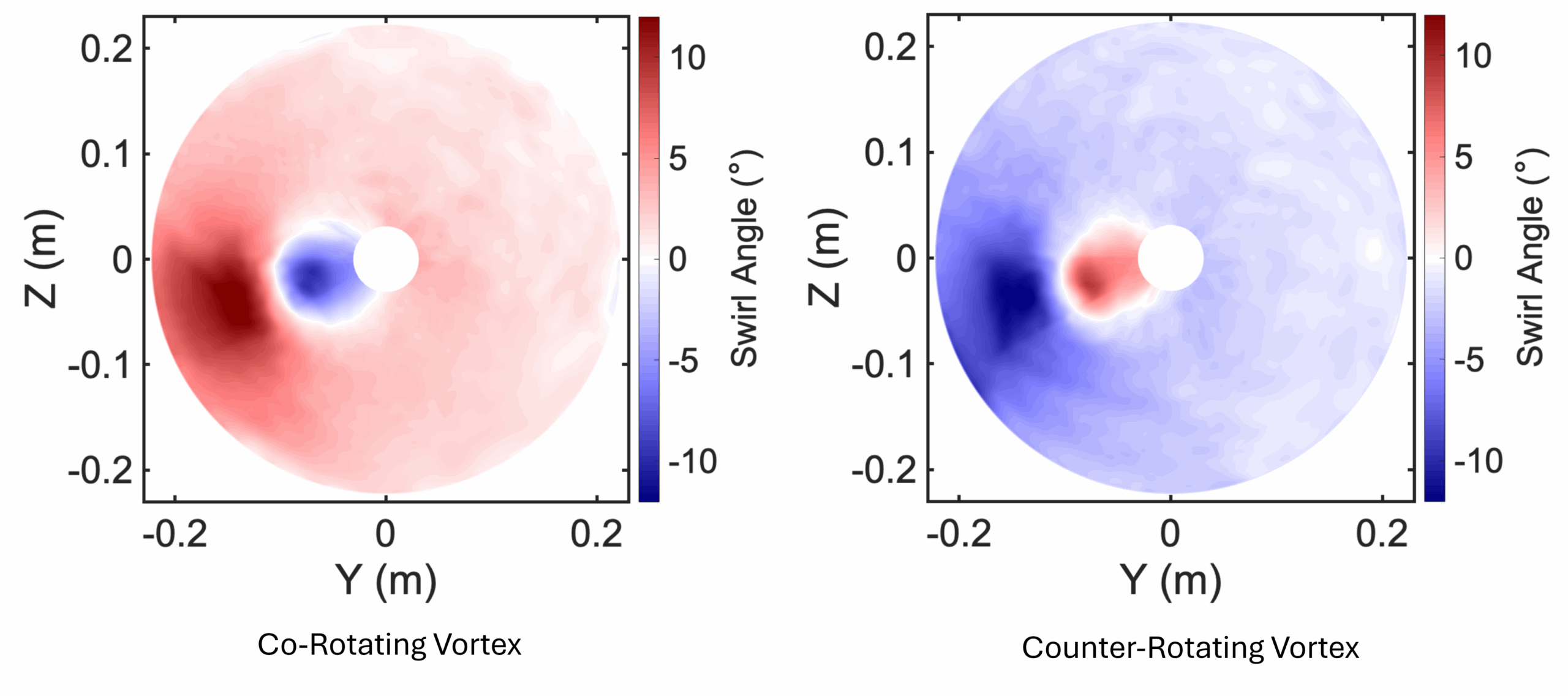 Two custom 3D-printed swirl-screens generated equal-strength, opposite-direction vortices at the fan face.